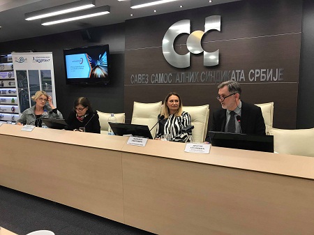 O zaštiti dostojanstvenog rada u fleksibilnim oblicima zapošljavanja, govorili su Branka Anđelković, Centar za istraživanje javnih politika, Martina Schneller, ProGe, Austrija, Čedanka Andrić, UGS NEZAVISNOST, Slobodan Lalović, SSSS.